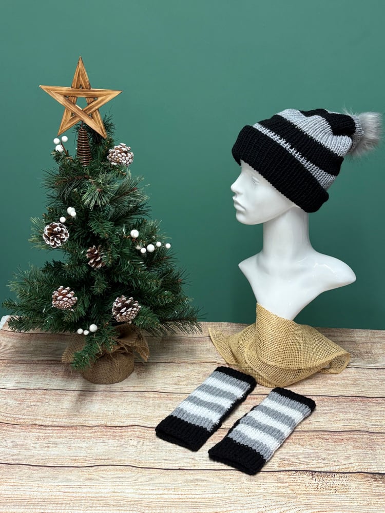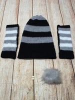 This Black, Grey and White Hat and Handwarmer set has been designed and handmade by us here at Kitchwitchknits.