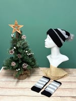 The hat comes with matching knitted handwarmers. It also comes with Pom Pom holder & Bobby pin to thread Pom Pom through hat & holder.
