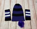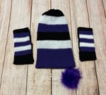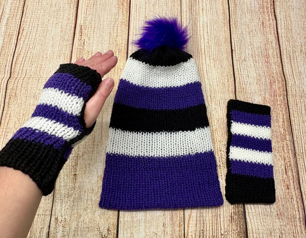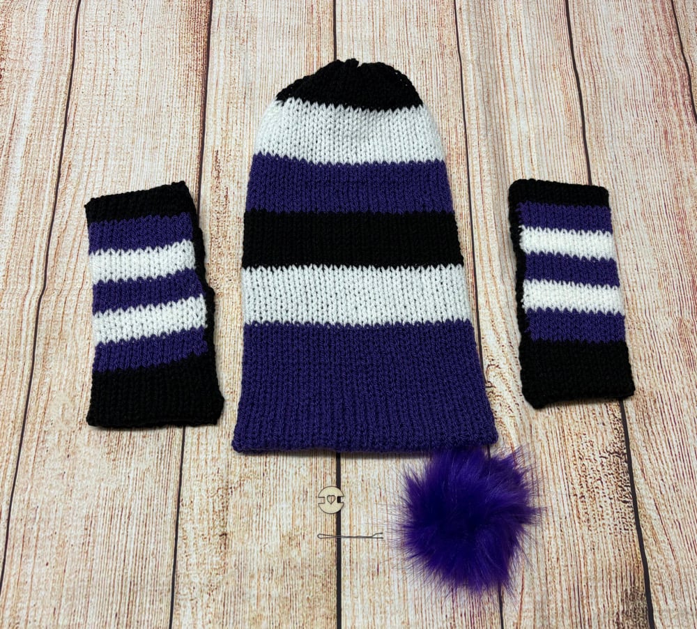 This Purple, White and Black Hat and Handwarmer set has been designed and handmade by us here at Kitchwitchknits.