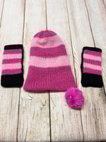 This Pink, Black and White Hat and Handwarmer set has been designed and handmade by us here at Kitchwitchknits.