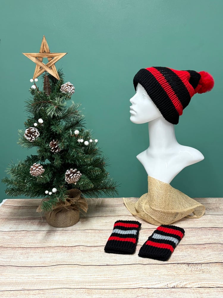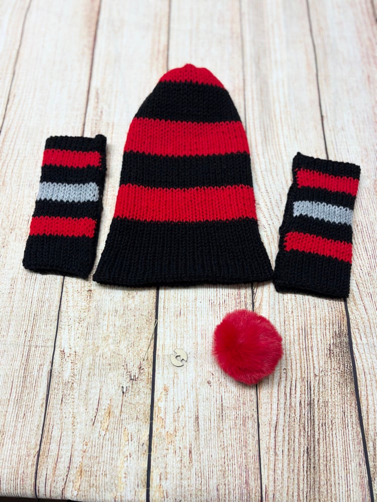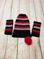 This Red, Black & Grey Hat and Handwarmer set has been designed and handmade by us here at Kitchwitchknits.