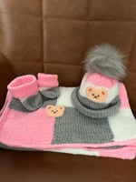 Cute Teddy Bear design made with Pink and white colours. This super cute Baby Gift set has lovely matching Teddy bear patches on both the hat and the blanket. The hat to this set also features a faux fur pompom.