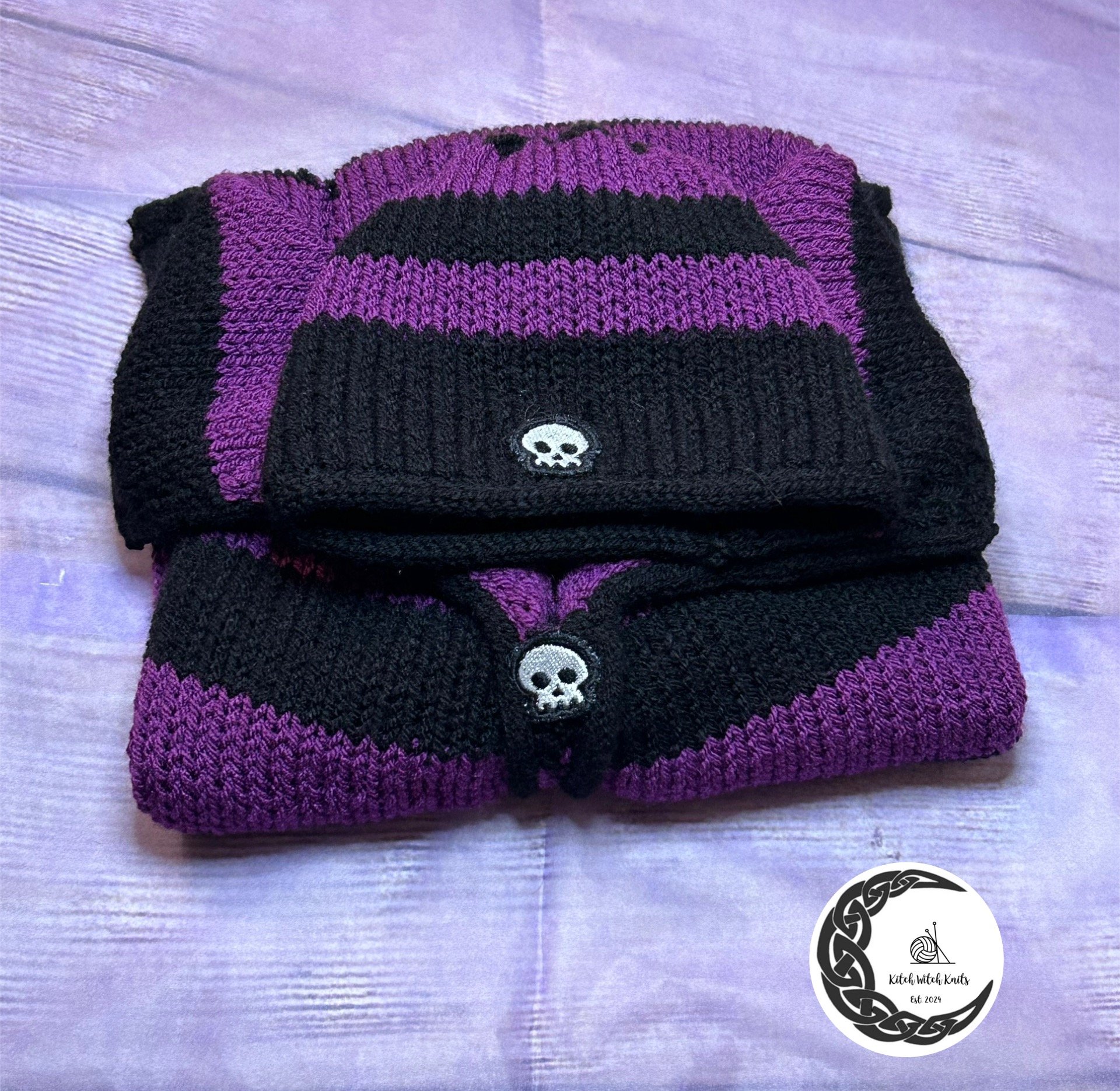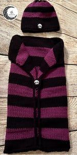 Knitted in black and purple stripes this set features two matching skull patches, one on the hat and one on the front centre of the sleeping bag.