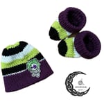 months the sets are made from Acrylic, double knit wool which is quite soft. Beetle design made with white, black, lime green and purple colours.