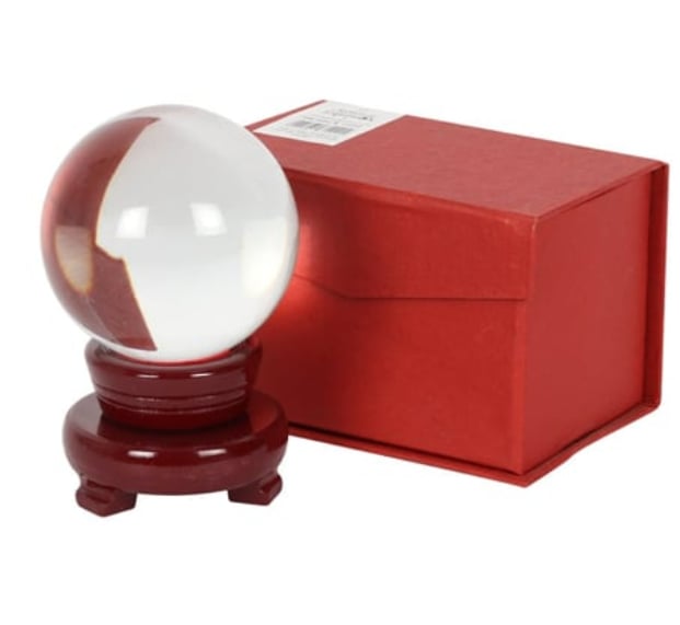 These crystal balls are available in different sizes. Each comes with a comes with a small wooden stand and is presented in a display box.