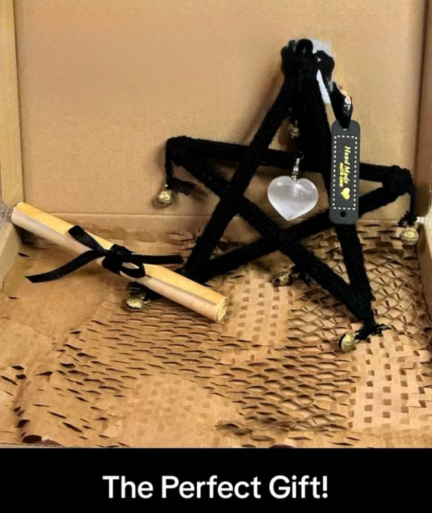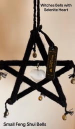 These handmade witches bells with Selenite Heart and Scroll have been created to bring joy and magick to any home. Handmade by us here at KitchWitchShop these bells have a black pentagram featuring a selenite heart and Feng Shui bells.