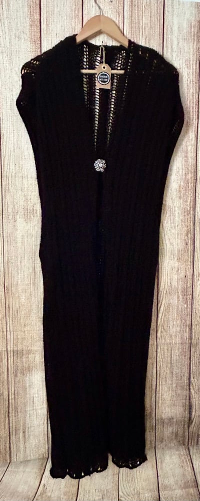 Long Knitted Waistcoat & Brooch, Handmade will fit up to Size U.K 14